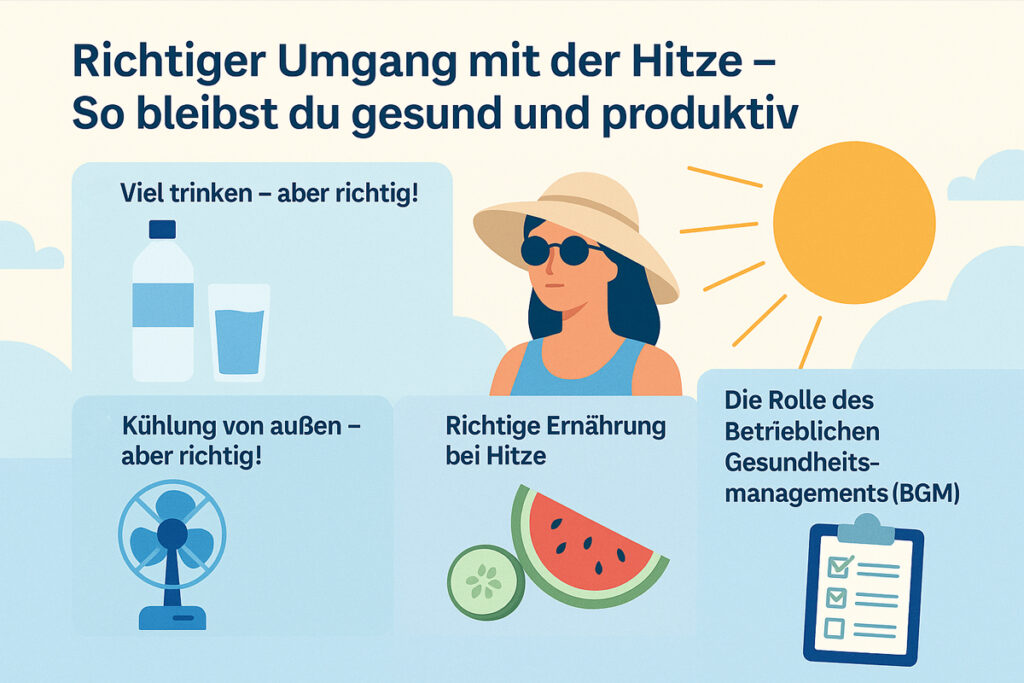Die Sommermonate bringen nicht nur Sonne und gute Laune, sondern auch extreme Temperaturen mit sich. Gerade in heißen Perioden ist es besonders wichtig, den richtigen Umgang mit der Hitze zu finden, um gesundheitlichen Problemen wie Hitzeschlag, Dehydrierung oder Kreislaufproblemen vorzubeugen. Für Unternehmen ist es ebenso entscheidend, ihre Mitarbeitenden zu unterstützen, indem sie präventive Maßnahmen im Rahmen des Betrieblichen Gesundheitsmanagements (BGM) ergreifen. In diesem Blogbeitrag erklären wir, wie du dich richtig vor der Hitze schützt und wie BGM dabei helfen kann, dass du sicher und gesund bleibst.